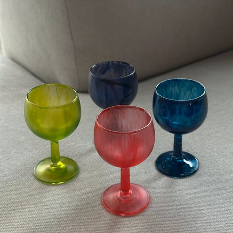 3 stk nye fargede vinglass i plast rød, orange og lilla, selges.