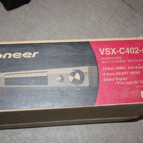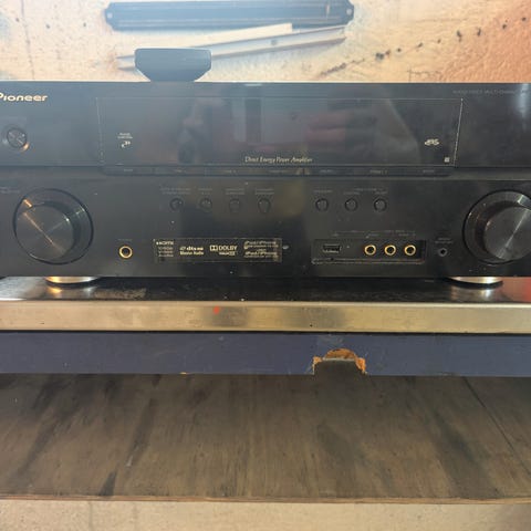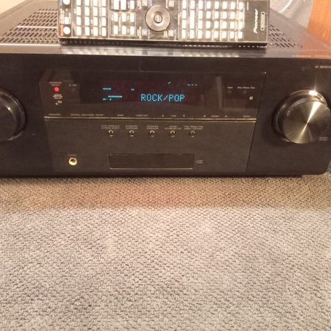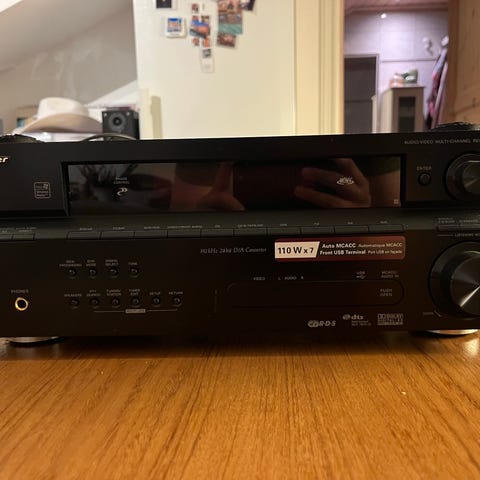Selger Pioneer VSX-D512 receiver inkludert Energy høyttalere 2stk front, 2stk rear og 1 stk center høyttaler. Inkludert kabler og fjernkontroll. Noen føtter/gummiknotter under høyttalere mangler. Må hentes