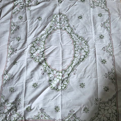Nydelig eldre beige håndbrodert duk,, Lengde 176 x bredde 123 cm. Innfelt heklet mønster . Litt korstinhg, og platt søm, Bølget kant, nederst.