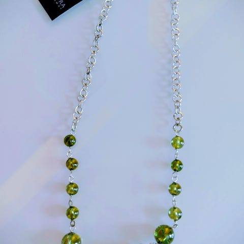 Helt nytt perlekjede med glassperler i gulhvit farge selges. Dråpeformet charm i glass medfølger.