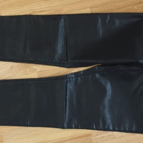Lekker, myk bukse med rette ben og strikk i livet fra Uldahl. Den ser ut som skinn foran, men er i PU og polyester. Innsiden er også myk og litt flosset. Romslig i størrelsen..