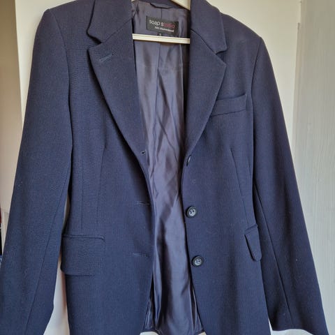 Blå blazer med innsving. Laget av polyester og bomull. Myk i stoffet. Tar imot bud.