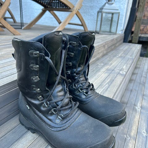 Klassiske lærstøvler fra lundhags. Kun prøvd noen timer. Deretter lagret tørt og mørkt. Sålen er 30,8cm lang. Bruker vanligvis 46. Originale skinnlisser. Høyde på skaft 33cm