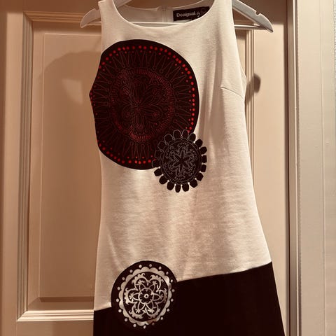 Nydelig Desigual kjole med applikasjoner. Ny, ubrukt med uten tag. Det står L på kjolen, men det er etter min mening en soleklar M. Jeg bruker 38/40 og denne sitter som støpt. De siste bildene er lånt fra nettside.