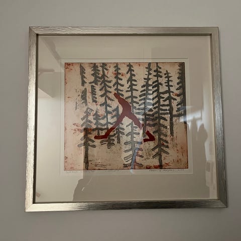 Tresnitt trykket i opplag på 15 eksemplarer. Eget trykk av selger Jarl-Åge Hanssen. Tittel: "Kveita og ekaillan". Motivmål: 33x26 cm. Rammemål: 52x42. Enkel ramme og passepartout inkl. Sender gjerne.