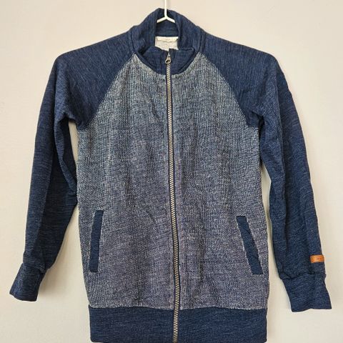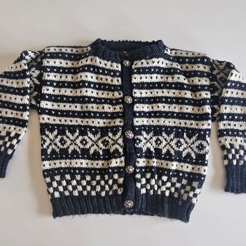 Handlagt, ren ull. I god stand bortsett skade på albuer (se siste bilde), lett å fikse ved litt kreativitet. f.eks ved.å sy på 2 stk. slitasjebestandige (skinn o.l.) lapper. Da blir den kjempe fin!