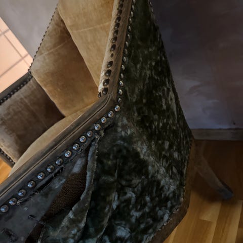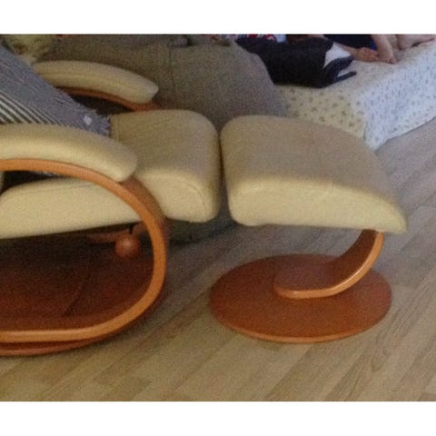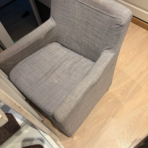 Stolen er tydelig slitt, men fremstår som hel . Ingen feil ved det tekniske med den. Fantastisk god å sitte i.