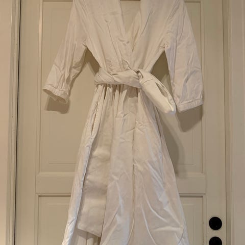 Vince kjole hvit i blanding av silke og bomull. Lang kjole med stikklommer, belte (om ønskelig) og halvlange ermer. Brukt to ganger. Ny pris var i overkant av 5.000,-