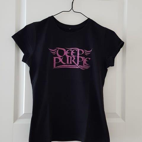 Offisiell Deep Pruple t-skjorte, pent brukt, kan sendes. Str. S. Den er ca. 57 cm lang og 43-44 cm bred (pit to pit). 249,- + frakt.