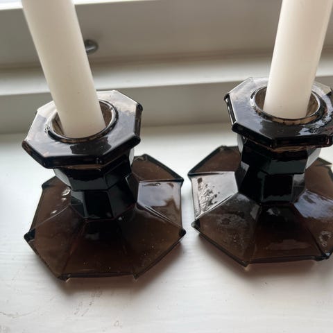 Veldig fin lysestake for små lys (gamle juletrelys) selges. Den er forsølvet messing. Den har anløp som ikke går vekk sim følge av bruk. Selve lysholderen(e) er i tre som er malt sort. Stemplet med M&J 60.