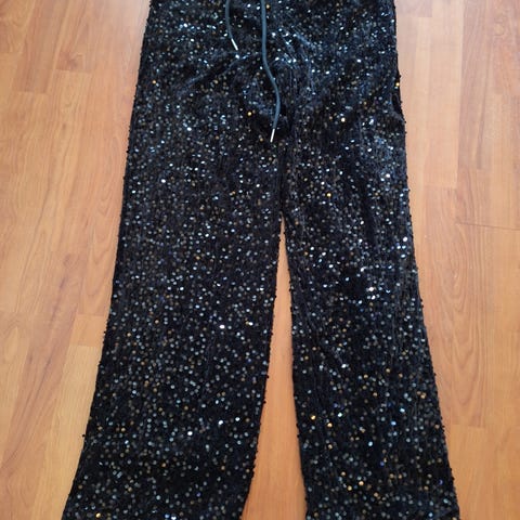 Selger en kjempefin sort damebukse i et behagelig stretch-materiale. Buksen har en flott tekstur og et lett skinn i stoffet som gjør at den passer like godt til fest som til hverdags.