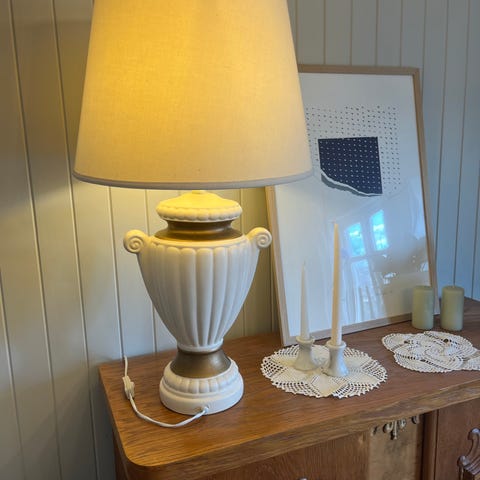Lampen er unik, jeg restaurerte den selv, som mange andre vaser du kan se i Finnen min🩵 Du finner eller ser ikke noe lignende noe annet sted, jeg har lagt ned mye kjærlighet, tid og arbeid i å lage det.🤍