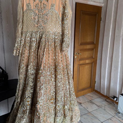 Veldig elegant og laget etter ønske. Kostet mellom 10 000 - 12 000kr. Veldig detaljert arbeid rundt hele kjolen. Følger med slør og bukse!