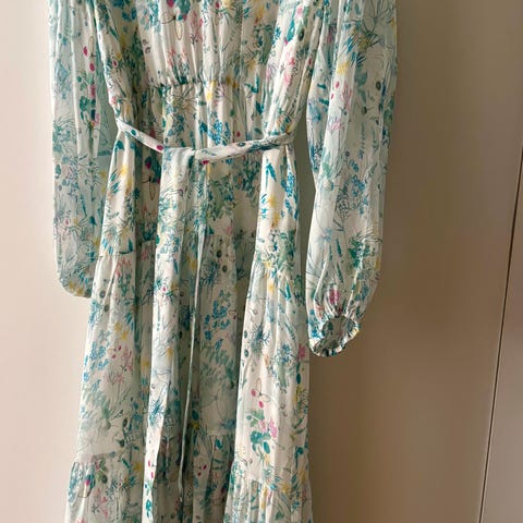 Hev stilen din med denne vakre silkekjolen fra Cavor i en delikat lysblå tone. Med en flatterende V-hals og snøring foran utstråler denne kjolen eleganse. De lange ermene med mansjettene legger til et snev av sofistikering, kjolen fremhever en feminin silhuett. Perfekt for enhver anledning, denne kjolen er et must-have i garderoben. Er i kvalitet og prissjikte som Zimmermann.