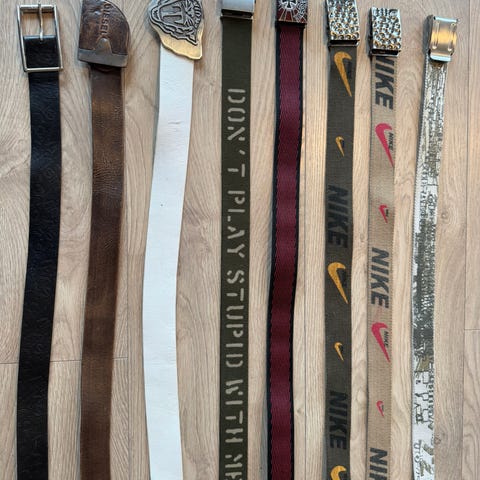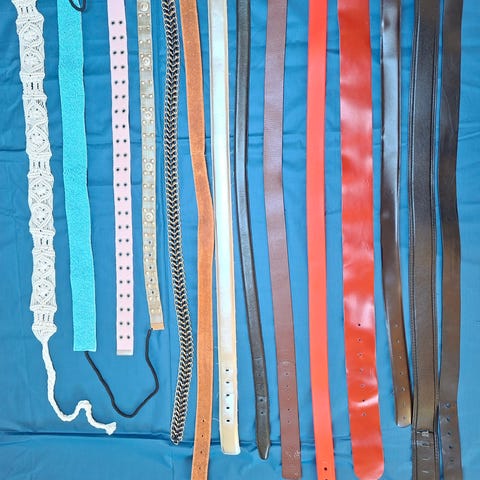 A058 Svart belte i sannsynligvis ekte lær med metalltrådsømmer Merke: Ukjent; Merkestørrelse: Ukjent. Tilstand: Noe av metalltråden har løsnet (se bilde) ellers bra. Mål: B 3.5, L 105, Y 98, I 69