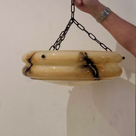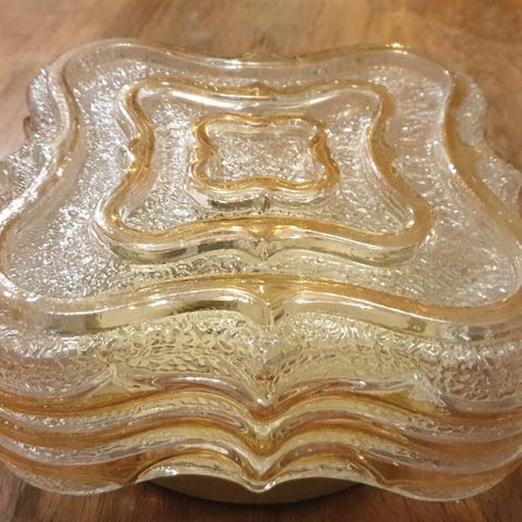 🌟 Frostet gul taklampe med stilige frynser og fantastiske detaljer. Stjerneformet klart glass rundt hele og tre messingbølger på toppen. 26 cm høy (uten frynser) og 25 cm i diameter. 😍