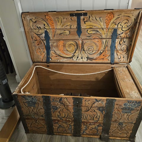 Vedkassen er tung, muligens heltre -med en veldig praktisk verktøyskuff i toppen