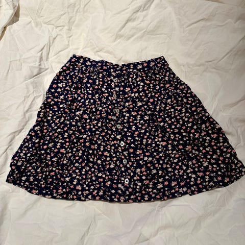 Blomstrete skjørt med strikk i livet med knapper langs skjørtet