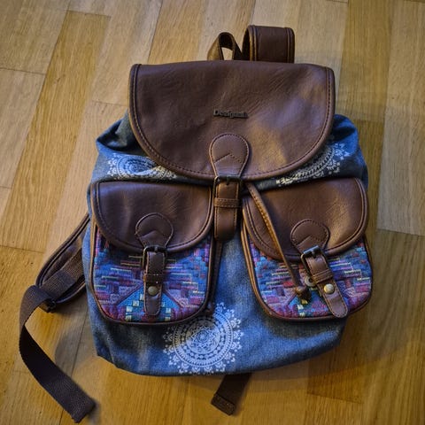 90s ryggsekk i fin stand. Nydelig mønster. Skinnlokk og lomme foran