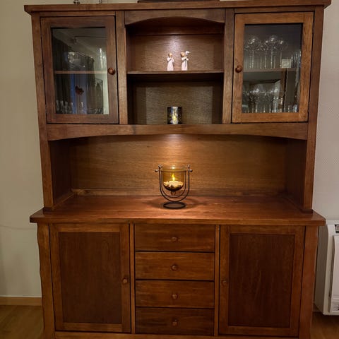 Det har vært i bruk hele tiden. Stått i både stue og kjøkken. Helt og fortsatt pent i mine øyne, Super solid kvalitets møbel.
