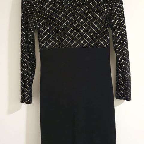 Sort selskapskjole. Korte ermer, åpne skuldre. Perledekorasjoner. Snøring i livet.
