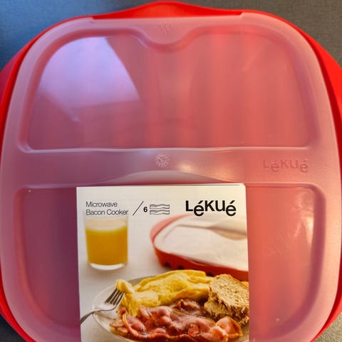 Kun brukt et par ganger. Se beskrivelse her: https://www.kitchn.no/kjokken/kjokkenutstyr/ovrige-kjokkenredskaper/lekue-bacon-maker/