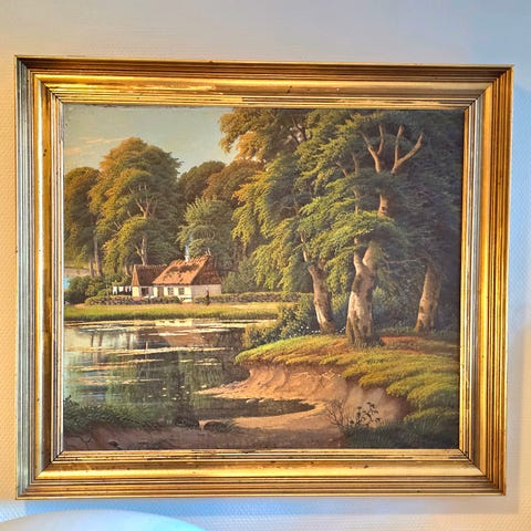 Oljemaleri. Innsjø med vannliljer. Signert (kunstner Anton Krautwig).