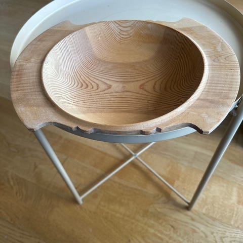 Håndlaget treskål med dekorativt mønster. Skålen er laget av tre og har et intrikat design på innsiden. Den naturlige trefargen gir et rustikt utseende, og skålen kan brukes som en dekorativ gjenstand eller til servering. Egnet for forskjellige interiørstiler. Fatet er laget av Gullik Norheim.