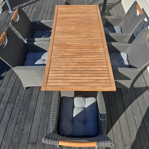 Liten bord med 3 stoler og puter + parasoll alt 1500.-kr