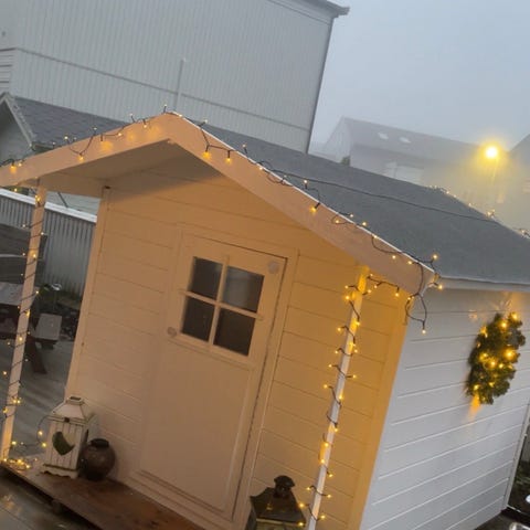 Det er en enkel hytte som står på pilarer/støtter opp fra bakken.
