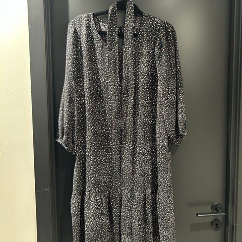 Behagelig oversized-kjole fra Ilse Jakobsen med dyremønster og smale striper med gulltråd. Knyting i hals og ermer, svart underskjørt. Knapt brukt, fremstår som ny.