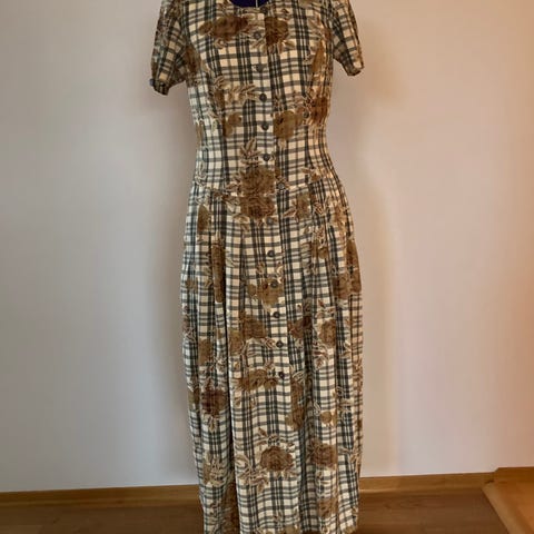 Den lukkes med glidelås i ryggen, knappene foran er kun til pynt. Stoffet er nok syntetisk, med rosa bunn og et blomstrete grått lag over. Kjolen har et noe avstivet underskjørt (dette har noen flekker, men disse påvirker ikke bruken).