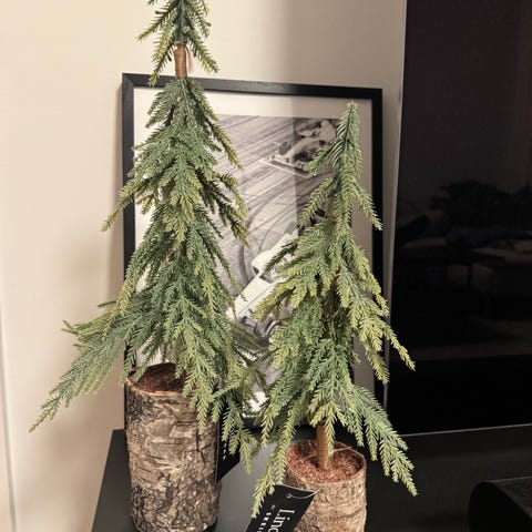 Dekorasjonstre med bøyelige grener. Noe kunstig snø på.
