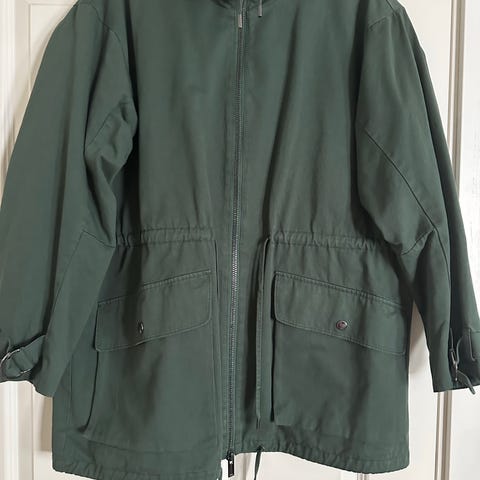 Den har to lommer i front og innerlomme. og er fôret med lyst fôr. (Shell: 68% polyester/30 % viscose, 2% spandex. Facing : 100 % cotton.)