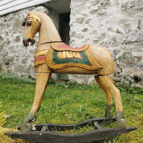 Fin og hel gyngehest, er nok laget i et fengsel en gang, litt skader i maling, halen klippet av en gang, ellers stødig og fin. Må hentes