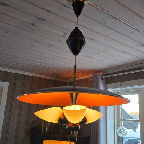 Nydelig vintage taklampe i teak og kobber selges. Hel og fin. Må hentes.