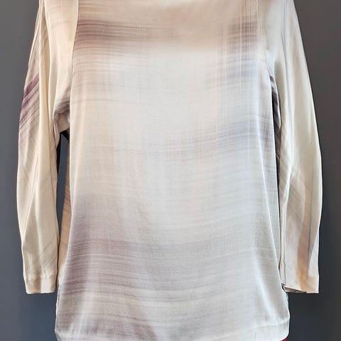 Kjøpt på Høyer. Passer S/M (liten i strl.). I 100% silke. «Bånd» i hals/ved ermer m.m. av 69% viskose, 28% nylon og 3% spandex. På bilde nr. 4 ses et kulepennmerke. Ellers pent brukt.