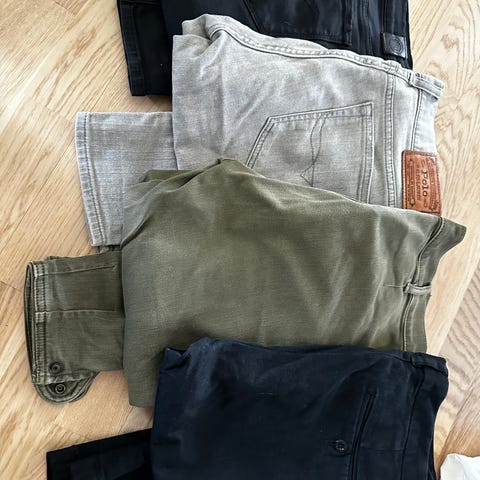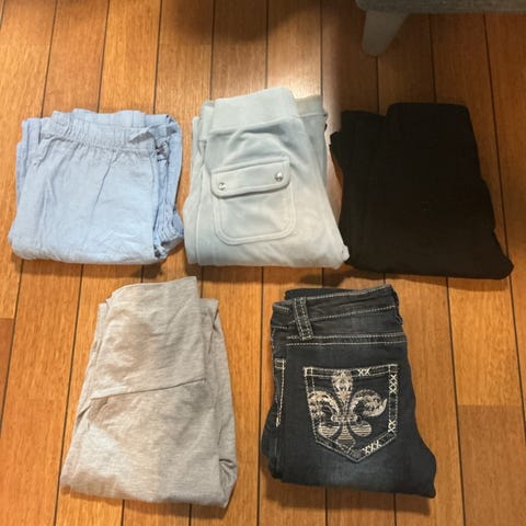 3 forskjellige bukse modeller, se bilde selges for kr 150. Den lengste er i str 40 men vil tro 42 er mer passende str, fra Carla F og mørke blå stoffbukse fra Jean Paul og 42 på siste dongeri. Den er noe mer brukt