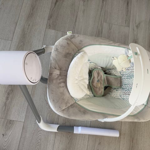 Madrass følger ikke med, da vi brukte vår babynest i vuggen. Jeg synes denne vuggen var perfekt – enkel å flytte mellom rom eller ta med på hytta el. Nederste ringen (liggedelen) måler sirka 80x40 cm, og øverste måler sirka 90x52 cm.