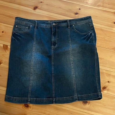 Dongeriskjørt fra Mirage i størrelse 38-litt romslig i størrelsen. Livvidde er 82 cm, lengde 56 cm. Laget av en blanding av bomull, polyester og elastan-god stretch i stoffet utover oppgitte mål. Lommer både foran og bak, hemper for belte og liten splitt fremme.