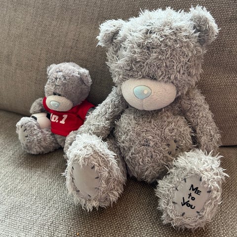 Størrelse- 30 cm på begge bamser. Kan selge sammen for 700 kr. Kjøpt i England i 2021 på fotballtur. Kjøpt som suvenirer og ingen barn har lekt med. De var bare stående i hyller.