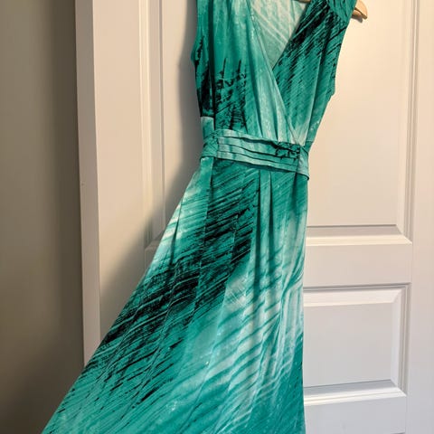 Fargerik og deilig myk kjole str L selges kr 119,-
