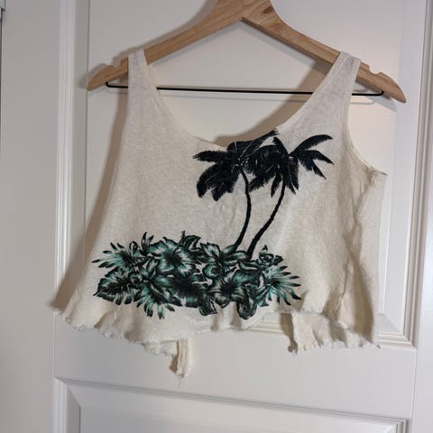 Fremsiden er hvit med grønne palmeblader og glatt stoff. Baksiden er grå i vanlig stoff.