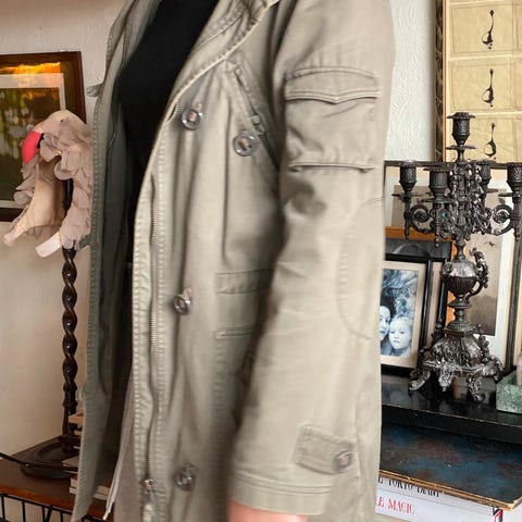 Råftøff 3/4 lang jakke, str M/L, superfin grønnfarge med gulldetaljer. Brukt et par timer, som ny!