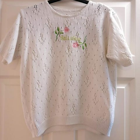 Gul Holzweiler genser med Holzweiler foran, oppleves litt stor i størrelsen.