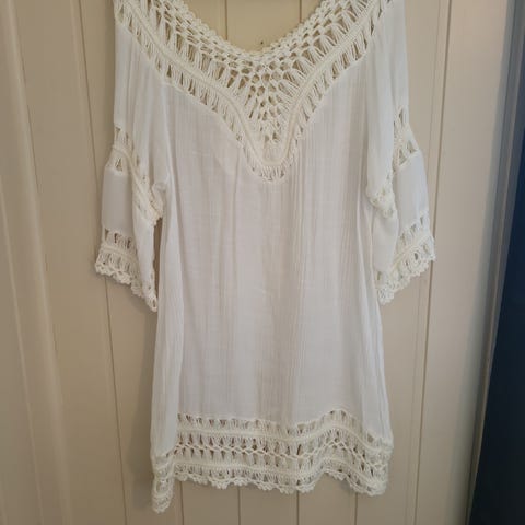 Nydelig offwhite kjole i viskose fra mbyM selges kr 270. Kjolen er bare brukt et par ganger da den dessverre blir litt for stor . Lekre detaljer i hals og over brystet luftig og behagelig kjole med strikk nedert på ermene. 100% viskose. Glidelås øverst i ryggen.