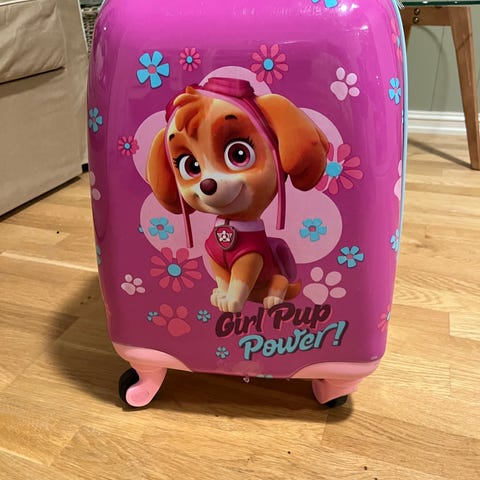 Søt og lett koffert fra Paw Patrol (for jenter) med utfellbart trekkhåndtak og hjul på undersiden. Den har en liten lomme med glidelås på utsiden, og det store hovedrommet åpnes med glidelås og inneholder stropper som du kan feste bagasjen med. Kjøpte nytt og kun brukt én gang. Nypris 600kr.