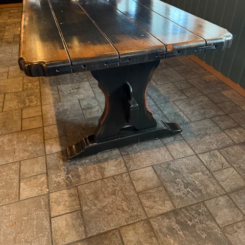 NY PRIS ! Spisebord i heltre selges. Bredde 112cm lengde 180. Følger med plate for å forlenge bordet. Er ferdig demontert, kan hentes 😊