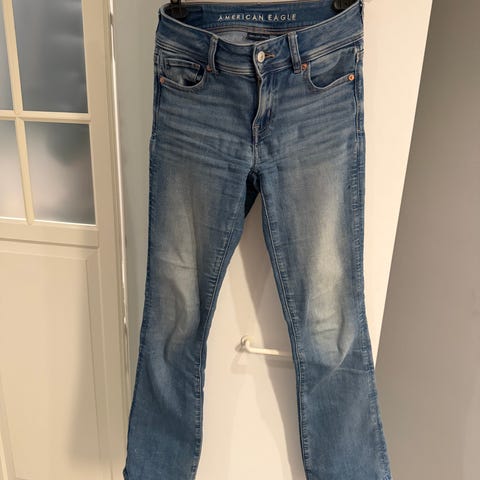 Denne limited Edition buksen fra American eagle har en fin mørk blåfarge med den klassiske lomme sømmen i en slags blå/lilla "perler" som glinser litt i motlys. Den er ekstra lowrise med sine 19 cm og noen vil si den har flare, selv om den går inn under "bootcut" categorien.