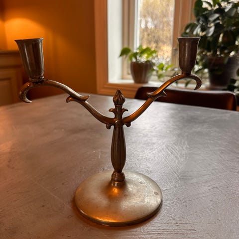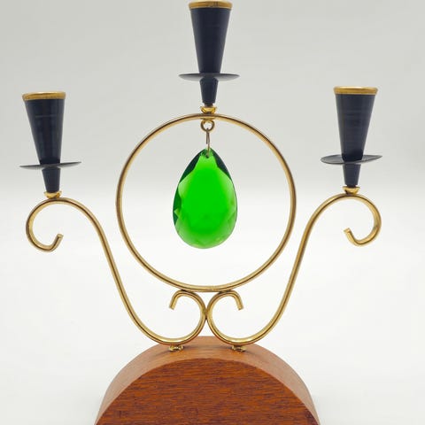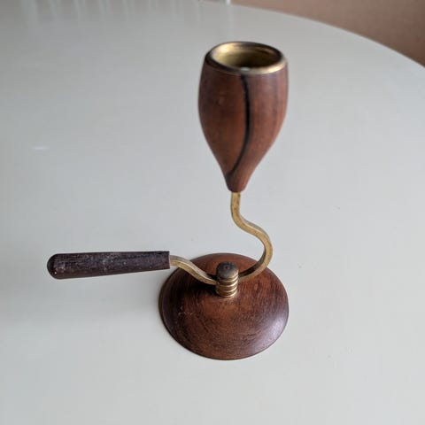 Teak og messing. Ca 13 cm høy.